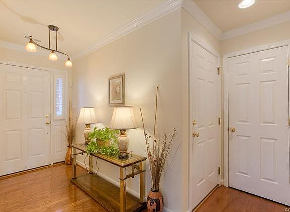 Maintenance-free living in Midlothian! Wheel chair accessible! The yard is maintained, the snow is cleared, and the home's exterior is cared for by the HOA (roof, siding, trim painting, power-washing is all on a regular schedule). There are no steps to the home in front or back, and both rear doors are extra-wide for ease of access. Inside, you'll find high ceilings, freshly-polished hardwood flooring, plantation shutters, updated lighting, and lovely crown molding & trimwork. The kitchen features stainless appliances, Corian countertops & center island. Beautiful sunroom is inviting year-round, with views of the landscaped corner lot. First floor owner's suite is complete with walk-in closets and gorgeous French doors to the patio; large bath includes spacious walk/roll-in tile shower. A comfortable screened in porch with knee-wall and two adjacent patios is accessed through doors from the owners suite. Second bedroom with full bath is on the main level. Upstairs, the third and fourth bedrooms are ideal for guests: window seat, large walk-in closets & private full bath. Need storage? There is a spacious walk-in unfinished areas equipped with warehouse shelving. This quiet section of Charter Colony also enjoys access to pools, tennis, playgrounds & sports courts. GREAT location close to shopping, dining, hospitals & interstates!