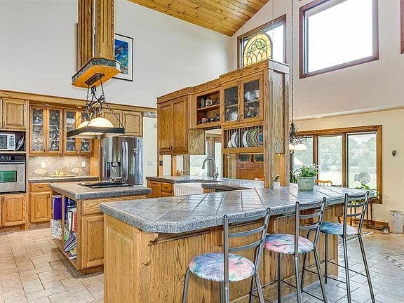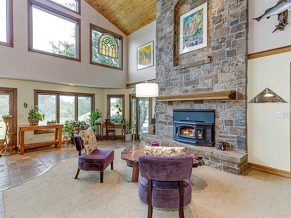 Buyer failed to perform so back on the market for you! Welcome to private country living at this 12 acre gated property minutes from the city. Custom built and well-maintained, this all-electric home is thoughtfully planned out in an open 1 ½ story design. A high ceiling entry and metal railing above set the tone to welcome you to this comfortable, tastefully appointed country home. Main floor features kitchen with tile floors, stainless steel appliances, cooking island, eating bar, farmerâs sink and ample storage in two pantries. Large banks of windows fill the home with natural light and cast a view out to the native grass pasture, wildflowers and pond. Anchored by the massive wood-burning stone fireplace with blower, the living area has room for many conversation groupings to fit your needs. A well-equipped office is tucked off the main hallway leading to the master with walk-in closet, separate tub, walk-in shower and double sinks. Open the windows at night in the other main floor bedroom for the peaceful sound of the waterfall/koi pond off the lit gazebo. Thereâs another full bath off the second bedroom. Upstairs loft is a versatile room, cedar closet and bedroom tucked neatly to the side. Off the attached 2-car garage with sink and hot water faucet, find a laundry/mud room with handy service door to the back. Entertain in the basement family/game room with wet bar and built-ins. Basement offers another bedroom and full bath with wet sauna and thereâs ample storage. Fantastic potential for a home office. Property features a heated/cooled 40X80 3-phase shop (served by a separate security gate off 140th) with wood-burning stove, well-lit work space, a new green house and 3 fully-finished offices with a half bath. Other buildings include an oversized 1-car detached garage with concrete flooring and electricity and a 2-stall pole barn with storage. Horses allowed. Pad for RV with 30 amp electric, water and sewer hookup available on north side of home. In the home, find 3 HVAC zoned units, two 50-gallon hot water tanks, water softener, rural water. Yard is on sprinkler system on a well and tilled garden is high-producing with no chemicals. Outside, delight in the rolling hillside, find pleasure in the variety of native trees and shrubs, relax on the lit gazebo with the waterfall/pond recently renovated by Hongâs, Home has exterior accent lighting and holiday outlets. No covenants. Wildlife viewing includes deer, quail and turkeys and many species of backyard birds. The 5 apple and 2 big cherry trees are fruit producing.