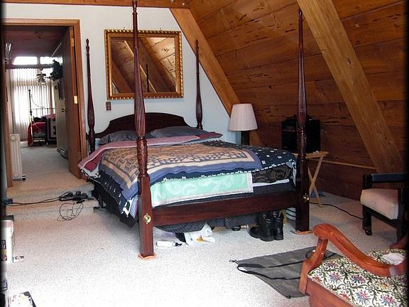 A HUGE VACATION HOME in the FOREST with a YEAR-ROUND CREEK! 3,000 SqFt double A-Frame, soaring ceilings. This exposed-beam 3-bedroom home is nestled among 6.1 acres of nearly flat beautiful forest and meadows. After eights months off-market for fixups & kitchen updates, home now has granite counter tops, Graber double insulating cellular blinds and, with acres of your own trees, Qaudra-Fire's largest wood stove rated to heat a 3,700 square foot home! Has zoned electric heat-backup throughout. Features a fun spiral stair case, loft overlooking the towering family room, with a view of the creek flowing in front, and solid wood ceilings. Loft bedroom not to code. The basement has two more rooms that could be finished. LARGE two-story primitive guest cabin ready to finish. Two more outbuildings. Swimming pool is recently inspected but older and not in service. Buyer to verify all information.