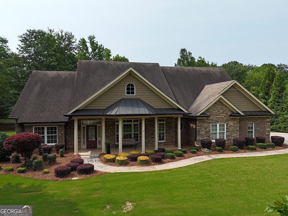 Craftsman style home located on a level 1.57-acre lot offering exceptional privacy while still being convenient to surrounding restaurants and shopping. This well-kept home features three bedrooms plus two and a half baths. Upstairs an additional bonus area is a blank canvas to expand your living space. This home features a spacious primary suite and two secondary bedrooms on the main level. The owner's suite offers an oversized closet and a large walk-in shower with separate tub. Its main living area has a separate dining room and living room that share a double-sided fireplace with an office/flex space all while providing plenty of outdoor light, bringing indoor and outdoor living together. The kitchen is perfect for entertaining with a large island, bar seating, gas cooktop, built in oven with solid surface countertops and walk in pantry. The covered back porch allows for ultimate views and relaxation. An additional detached garage is perfect for any projects or additional storage.