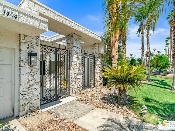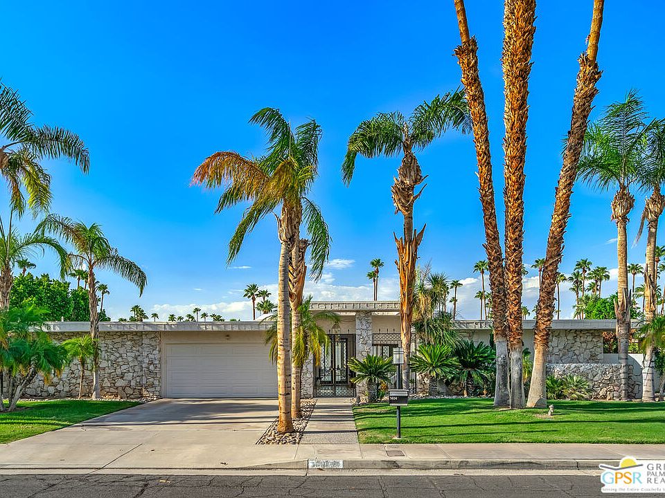 Experience Palm Springs' architectural heritage in this beautifully renovated Charles Du Bois-designed home, located within the Canyon Estates community in the desirable Indian Canyons neighborhood. Built in 1972 and fully updated between 2021 and today with approximately $300,000 in improvements, this residence perfectly blends preserved mid-century character with modern comfort, style, and efficiency, framed by panoramic, unobstructed mountain views without unsightly power poles and wires. Step inside to terrazzo porcelain tile flooring that flows seamlessly from the entry through to the rear patio for effortless indoor/outdoor living. The focal point of the main living space features a stunning floor-to-ceiling gas fireplace in buff stone, built by the original stonemason who created the outdoor walls. The living room and hallway ceilings have been refinished, all interiors have been freshly painted, and over 40 recessed lights, plus six ceiling fans, have been installed for a bright and breezy feel. Three bathrooms have been completely reimagined with designer tile, custom vanities, premium fixtures, and cabinetry, while one original 1972 bath featuring its tub, walk-in closet, and vintage details remains preserved. Authentic mid-century elements include a mirrored entry ceiling, an original mirrored bar that adds a swanky 70's touch, and a mirrored accent wall in the former primary bedroom currently used as an office and guest bedroom, Lucite vanity pulls, sliding pocket doors, retro kitchen accordion doors, and original breakfast area cabinetry. The kitchen harmonizes classic design with modern updates, including a Bertazzoni gas range, Bosch dishwasher, reverse-osmosis filtration, and a dining room pass-through. In 2022, the original marquis-shaped pool was completely rebuilt with PebbleTec finish, glass tile, and an adjacent spa, both with remote control operation. Deck surfaces were refinished with cool-touch paint, and a full outdoor kitchen was added, complete with plumbed barbecue, sink, storage, and bar seating. Additional upgrades include a tiled outdoor shower, built-in concrete block planters and bench seating, and a gas firepit for evening gatherings. This home boasts a new 25-year roof, 37 owned solar panels (with an average electric bill of approximately $150/month), and a 14kW battery backup capable of powering essential appliances during outages. A new Trane AC system cools the main home, while a mini-split in the garage ensures year-round comfort for hobbies or storage. One other interior AC unit is also in place. Canyon Estates offers 15 sparkling pools, tennis and pickleball courts, a private, executive 9-hole golf course, landscape maintenance both in front and back yards, a fitness center, Spectrum cable and internet, a well-appointed clubhouse with many social activities, earthquake insurance, and lushly landscaped greenbelts. Select furnishings, including a rebuilt 13.5' vintage sofa with curved table, Barcelona chairs, pool lounges, and Adirondack seating, are available outside of escrow. This is a rare opportunity to own a masterfully restored mid-century modern gem offering architectural pedigree, thoughtful upgrades, and the ultimate Palm Springs resort lifestyle.