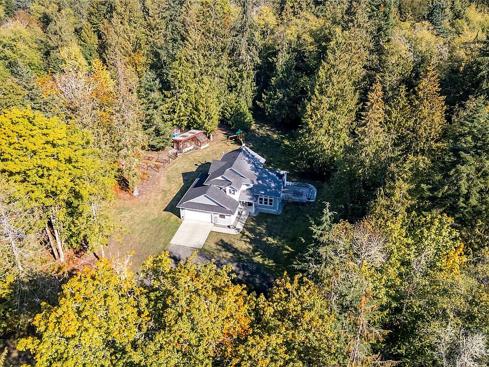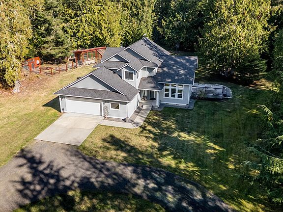 This custom built home on private 5-acre offers nature-filled lifestyle with modern comfort. Forested park-like setting. Expansive deck overlooking lively pond, firepit, greenhouse, fenced garden create a self-sustaining retreat. Features 3 bed 3 bath plus a flexible bonus room for guests, gym, office etc. Every detail is perfectly executed - simply arrive and enjoy the effortless elegance. High ceilings, high-end Bosch appliances, quartz counters, large island compliments fun gatherings. Primary suite with shower and soaking tub. Fully finished garage with EV charger. Heat pump plus propane fireplace. RV parking spot by circular driveway. NO HOA. Secluded yet minutes to amenities and countless outdoor attractions of Olympic National Park.