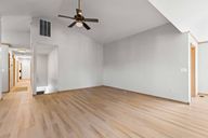 Newer flooringOpen-concept designFormal dining roomBuilt-in hutchBreakfast barVaulted ceilingsGas double oven range