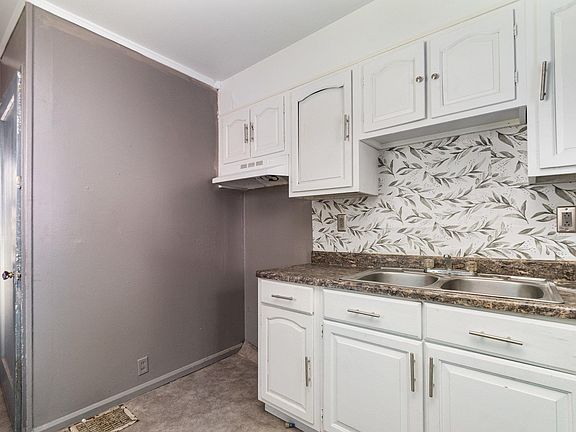Blue exterior doorClassic ranch-style facadeLarge windowsCorner lotGenerous front yardDecorative backsplashWhite cabinetry