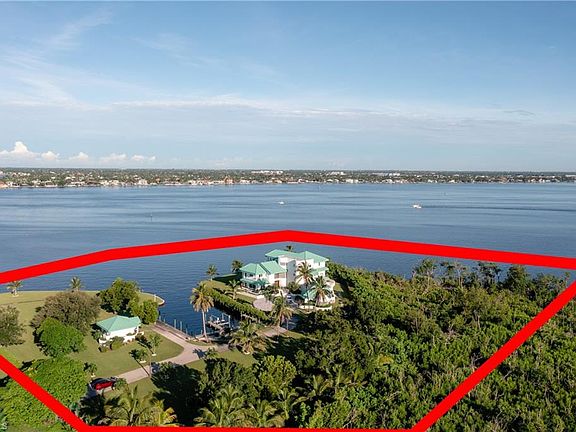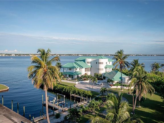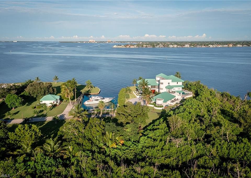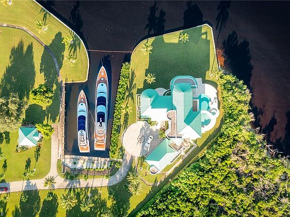 The Crown Jewel of Southwest Florida. An irreplaceable private waterfront compound of rare pedigree — the only estate in Southwest Florida boasting its own grandfathered-in Super Yacht Marina, capable of accommodating vessels exceeding 150 feet directly on-site. This 5.73-acre peninsula sanctuary is a landmark of distinction, embracing more than 1,000 feet of shoreline with sweeping, cinematic 9-mile vistas stretching from the skyline of Fort Myers to the luminous sunsets over Sanibel. Approached by a quarter-mile gated drive framed by sculpted palms and custom iron castle gates, the property opens to an all-concrete contemporary residence, recently reimagined in elegant white. The home’s minimalist architecture offers soaring walls ideal for art display, seamless indoor-outdoor flow, and breathtaking water views from nearly every room. Six bedrooms, five and a half baths, and multiple living and entertaining areas define a residence as refined as it is resilient. The estate’s non-duplicable Super Yacht Marina is its defining masterpiece — a deep-water yacht basin with approximately seven feet of depth at mean low tide, capable of accommodating multiple large vessels with full-service infrastructure. Power, water, and fuel are on-site, and an air-conditioned guest residence sits directly alongside the marina, complete with a full kitchen, bath, and its own generator. This versatile space serves as the ultimate captain’s quarters, guest retreat, or private waterfront lounge — a seamless extension of the estate’s rare maritime luxury. Beyond the existing residence, the land itself offers extraordinary potential: the opportunity to create additional panoramic-view homesites through subdivision into two or three parcels, or to add luxury amenities such as sport courts, pavilions, or wellness gardens. The newly installed seawalls, manicured lawns, and lush tropical landscaping create an irreplaceable private resort atmosphere. Hidden from view behind mangrove-lined shores yet only moments from the Gulf of Mexico and SW Florida International Airport, this estate is known to every mariner navigating the Intracoastal toward Fort Myers — the iconic white mansion at the bend of the waterway. More than a home, this is a statement of legacy — the Crown Jewel of Southwest Florida — for the discerning few who seek the rarest of luxuries: privacy, permanence, and perfection.