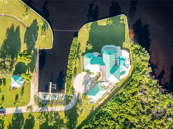 The Crown Jewel of Southwest Florida! An irreplaceable private waterfront compound of rare pedigree — the only estate in Southwest Florida boasting its own grandfathered-in "Super Yacht Marina", capable of accommodating vessels exceeding 125+ feet directly on-site. This 5.73-acre peninsula sanctuary is a landmark of distinction, embracing more than 1,000 feet of shoreline with sweeping, cinematic 9-mile vistas stretching from the skyline of Fort Myers to the luminous sunsets over Sanibel. Approached by a quarter-mile gated drive framed by sculpted palms and custom iron castle gates, the property opens to an all-concrete contemporary residence, recently reimagined in elegant white. The home’s minimalist architecture offers soaring walls ideal for art display, seamless indoor-outdoor flow, and breathtaking water views from nearly every room. For ultimate convenience, an elevator is available to smoothly connect access to all floors of the main residence. Six bedrooms, five and a half baths, and multiple living and entertaining areas define a residence as refined as it is resilient. The estate’s non-duplicable Super Yacht Marina is its defining masterpiece — a deep-water yacht basin with approximately seven feet of depth at mean low tide, capable of accommodating multiple large vessels with full-service infrastructure. Power, water, and fuel are on-site, and an air-conditioned guest residence sits directly alongside the marina, complete with a full kitchen, bath, and its own generator. This versatile space serves as the ultimate captain’s quarters, guest retreat, or private waterfront lounge — a seamless extension of the estate’s rare maritime luxury. Beyond the existing residence, the land itself offers extraordinary potential: the opportunity to create additional panoramic-view homesites through subdivision into two or three parcels, or to add luxury amenities such as sport courts, pavilions, or wellness gardens. The newly installed seawalls, manicured lawns, and lush tropical landscaping create an irreplaceable private resort atmosphere. Hidden from view behind mangrove-lined shores yet only moments from the Gulf of Mexico and SW Florida International Airport, this estate is known to every mariner navigating the Intracoastal toward Fort Myers — the iconic white mansion at the bend of the waterway. More than a home, this is a statement of legacy — the Crown Jewel of Southwest Florida — for the discerning few who seek the rarest of luxuries: privacy, permanence, and perfection.