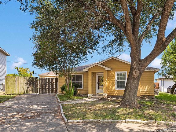 Charming single-story home nestled on a quiet cul-de-sac in the sought-after Wildflower subdivision. This prime homesite backs to a serene greenbelt and sits directly across from a playground, pond, and scenic hike-and-bike trails at the nearby park. Inside, the open-concept living and dining area flows seamlessly into the kitchen, featuring black appliances, a built-in microwave, and a sink with a backyard view. The spacious primary suite includes a full en-suite bath, while ceramic tile floors highlight the main living areas and cozy carpet enhances the bedrooms. Step outside to a large backyard with an expansive patio, in-ground basketball hoop, and a custom-built garage offering extra storage or workshop space.