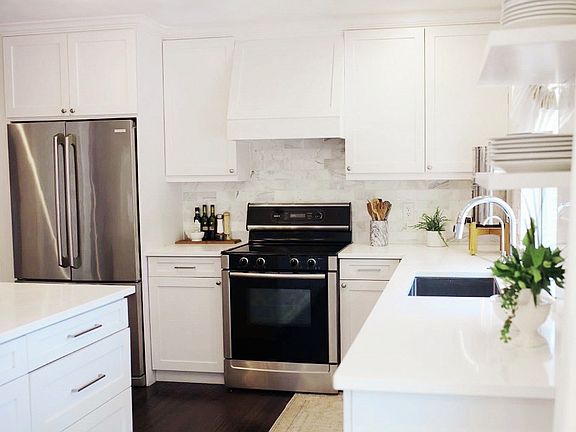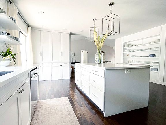 Stylish Kitchen: Enjoy cooking in a fully renovated kitchen with custom white cabinetry, a large center island with tons of storage, quartz countertops, stainless steel appliances, and modern pendant lighting.