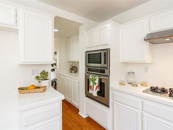 This unit has stainless steel appliances, including refrigerator, microwave, oven, stove, and dishwasher
