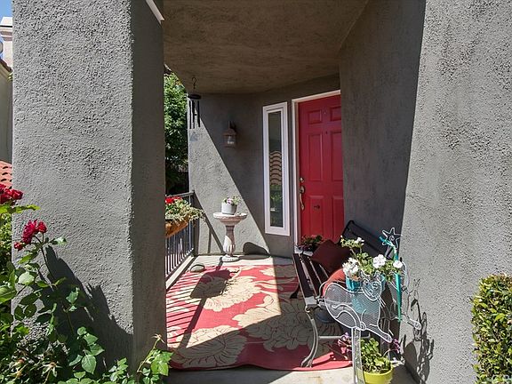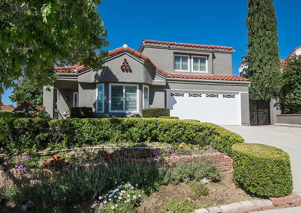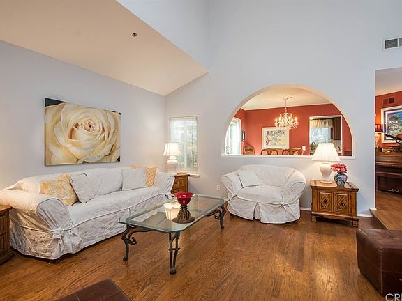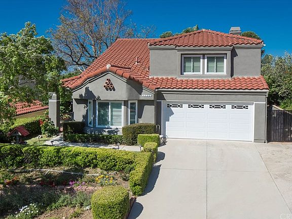 Check out this beautiful home with a view of the surrounding hills! With its freshly painted exterior and lush landscaping you will fall in love at first sight. Upon entering you will immediately notice how light, bright and open this home feels with its vaulted ceilings and newer dual-paned windows and sliding doors. This home features a step-down formal living room and a formal dining room with a sliding glass door that leads out to a private sitting area. The kitchen has recessed lighting, refaced cabinets, tile floors and countertops and a sun-lit breakfast room with bay windows. Adjacent to the kitchen is your family room complete with fireplace and wet bar. There are three bedrooms (one downstairs) and three bathrooms, along with an extra-large bonus room that's great for family entertaining or possibly used as a fourth bedroom. Vaulted ceilings, arched entryways, wood flooring and white shutters make this home truly special. The large, private, entertainer's backyard is centered around a tranquil fountain and features a solid covered patio with ceiling fan, built-in BBQ, refrigerator and eating area. All you need to do now is sit back and enjoy the beautiful sunsets! (Refrigerator, Washer & Dryer are included in the sale)