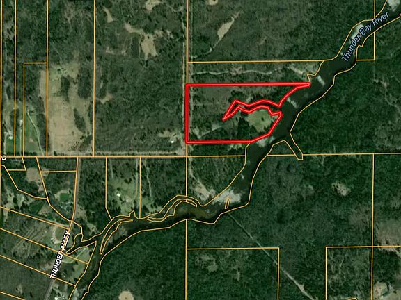 Log Home on the Thunder Bay River 22-Acres Hillman, MI Montmorency County Michigan. 1-1/2 Story Full Log Cabin on the Thunder Bay River has moving water on three sides with approximately 760-Ft of Water Frontage.