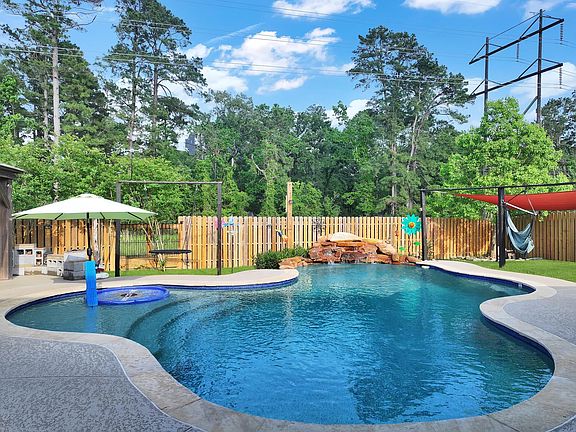 PRIVATE POOL OASIS with an immaculate 4-bed, 3-bath one-story home in sought-after Fosters Ridge with stone and brick exterior, custom built in cabinets, and bright open floor plan. Features wide entryway, abundant natural light, and large windows throughout. The kitchen is ideal for entertaining with a large island, granite counters, All upgraded glass front appliances, under-cabinet lighting, and walk-in pantry. Living room opens to a spacious backyard with covered patio, private pool, and outdoor cooking area—perfect for entertaining. The oversized primary suite includes dual sinks, soaker tub, separate shower, walk-in closet, and bonus craft space. Rest easy knowing when there are power issues you have a whole home Generator ready to keep your power on through any weather issues! Enjoy neighborhood amenities with a green belt area directly behind the home, top-ranked schools and The Woodlands just minutes away.