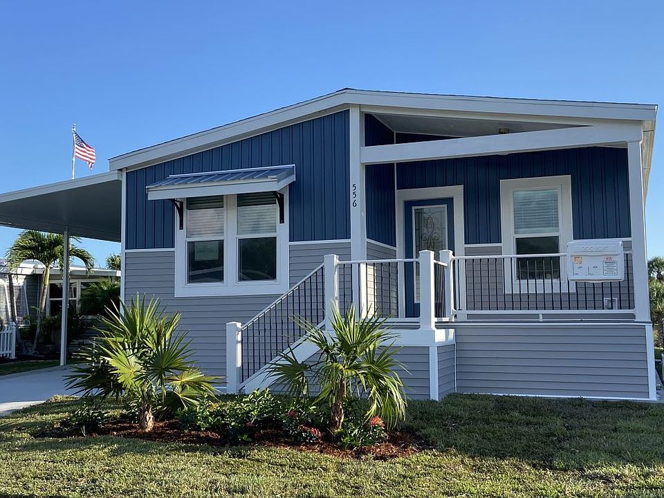 UNDER CONSTRUCTION. WELCOME TO VERO PALM ESTATES, A 55+ AGE-QUALIFIED ACTIVE AND VIBRANT COMMUNITY, where you can find yourself in your dream home. We have a gorgeous, brand new, 2025 2 bed, 2 bath home for sale featuring 1019.36 sq ft of beautifully designed living space. Located in Vero Beach, this property offers the perfect blend of modern amenities and timeless charm. Step inside to find luxury vinyl plank floors, high ceilings, crown moulding and so much natural light. The kitchen boasts an oversize island kitchen, energy efficient stainless steel appliances, farmhouse sink with gooseneck faucet and custom cabinetry, perfect for both everyday living and entertaining. The spacious primary suite offers a peaceful retreat, complete with dual vanities, walk-in closet and beautiful walk in shower. The additional bedroom provide versatility for guests, a home office, or additional quiet room. Outside you will enjoy the low-maintenance landscaping and backyard oasis with the beautiful lakeside view, ideal for entertaining and enjoying the outdoor views. Located in the desirable Vero Palm Estates, residents enjoy access to a range of premium amenities including a resort-style pool, fitness center, beautiful clubhouse, tennis/ pickleball courts, shuffleboard court and a dog agility park. Conveniently situated near shopping, dining and easy access to highway I-95, you'll have everything you need just minutes away. Stock photos, some colors, finishes and options may be different. Whether you're looking for relaxation or recreation, this community has it all. Financing available! Call today to schedule a tour!