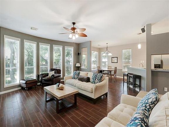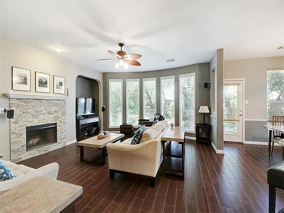Tucked away on a cul-de-sac with lots of mature trees, this home has one of the biggest lots and best floorplans in the neighborhood. The extra-long backyard is adorned with shade trees and a treehouse with a zipline! This home has been well-maintained and has lots of upgrades including: granite countertops, wood tile floors, stone fireplace, white painted kitchen cabinets, recent dual zone A/C and water heater. Open concept living/dining/kitchen area has an eat up bar. Huge wall of windows provides lots of natural light for main entertaining area. Carpet only in bedrooms- has wood tile floor everywhere else. All 4 bedrooms upstairs and a separate office/flex space on the main floor. Walk to community pool and Starbucks.