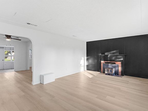 Freshly updated home featuring new interior paint, modern flooring, and a spacious living area with a fireplace and large front windows that bring in great natural light. The kitchen includes white cabinetry, updated counters, and a clean tile backsplash. Bedrooms offer updated lighting and generous room sizes, and the bathroom features a refreshed vanity and tiled shower surround.Enclosed patio/sunroom adds extra usable space.There is a separate laundry room that provides added convenience. The property sits on an oversized lot with mature trees, plenty of outdoor space, and a detached garage for additional storage or parking. A great opportunity to continue adding value and make the space your own.