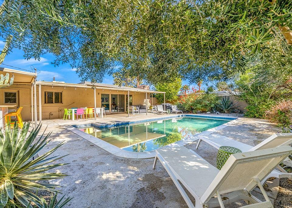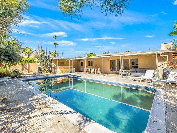 Centrally located in the heart of the vibrant Palm Springs area, this beautifully designed 3-bedroom 2-bath home is full of plenty of natural light and newly updated appliances. This Mid Century mid-century modern gem offers an entertaining indoor/outdoor lifestyle with interior glass walls and slider showcasing a gorgeous landscaped, fenced in backyard featuring mountain views, a covered patio and refreshing pebble swimming pool, creating a quiet, peaceful setting. Smart touches throughout include; spacious white shaker cabinets in the kitchen, light, earth tone tile floors in all the living areas and bathrooms, central air, fireplace and a two-car garage plus extended driveway to store the boat or RV. Over 10,000 sq ft lot so great potential for further renovations! Take advantage of this amazing Movie Colony location, just minutes away from shopping, schools, parks and the vibrant Downtown strip. Reach out today for a showing!