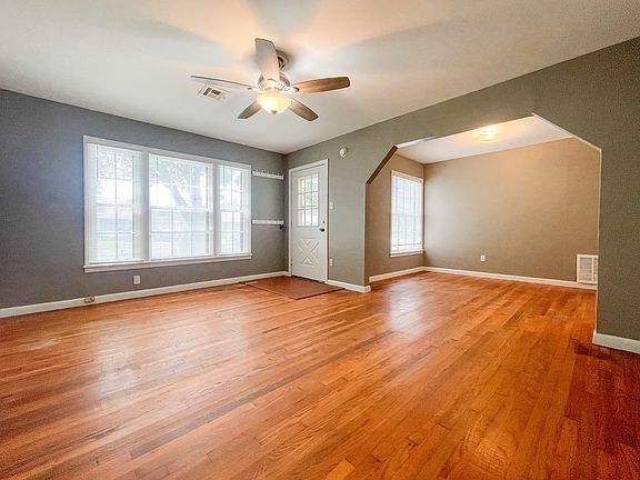 The spacious kitchen features new butcher-block countertops, tons of storage and shelving, and flows seamlessly into the dining room through a unique arched entry. Large windows with blinds bring in plenty of natural light, and ceiling fans in every bedroom and living area help keep things cool.