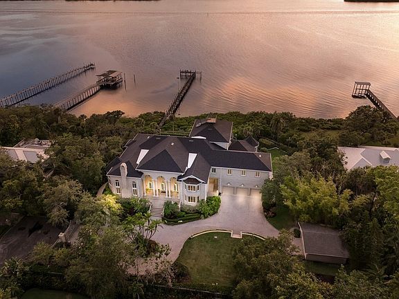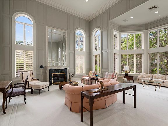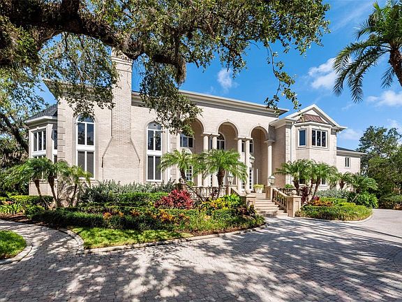 Situated on 1.1 acres and 170' of shoreline at the end of a private tree-lined street, this Bayfront estate is a true masterpiece of design, craftsmanship and grandeur. An unparalleled lifestyle awaits behind this extraordinary property's stately iron gates, including elegant and generous indoor-outdoor spaces, beautifully manicured grounds with towering oaks and picturesque views of Sarasota Bay. Reminiscent of late 19th-century and early 20th-century estates owned by industry tycoons such as the Vanderbilts and Rockefellers, the 12,724-square-foot multi-level residence boasts an Indiana limestone exterior, striking architectural details and exquisite finishes and fixtures at every turn. Framed by majestic stone columns and high arched openings, an expansive portico with a trio of French doors welcomes you to a dramatic foyer with marble flooring, impressive sight lines and a spectacular curved stairway. The grandiose formal living room showcases a 20-foot ceiling, ornate stone fireplace and soaring tiered windows with views of stunning mature oaks. Multiple French doors in the living room, family room and kitchen seamlessly transition to voluminous covered and open poolside patios that are perfect for large-scale entertaining, intimate gatherings or tranquil relaxation while savoring breathtaking water views. A gracious formal dining room infused with natural light is on the opposite end of the foyer. This level includes an inviting waterside family room with extensive custom wood cabinetry, a coffered ceiling, large saltwater aquarium and a well-appointed kitchen with a spacious window-filled breakfast area with gorgeous bay views. The capacious primary suite nearby offers a luxurious private retreat with incredible views of the water and scenic landscape through a wall of glass doors and a sitting/desk area with bay windows, a palatial custom closet and luxurious spa-like bathroom with marble flooring. On the second level, a dazzling crystal chandelier over the staircase is the centerpiece of a spectacular gallery with a soaring ornate ceiling and viewing balcony overlooking the living room. The second level also features a sophisticated library, separate guest wing with three en-suite bedrooms, sprawling game room with access to a large terrace, charming art studio and an enormous "future space" with endless possibilities to suit your needs. On the third level, you'll enjoy a sizable sitting room with water views and an adjacent terrace with spiral steps to an observation deck showcasing mesmerizing views of the bay and Siesta Key to the west, downtown Sarasota to the north, bridges and surrounding neighborhoods. This remarkable residence also boasts a ground-level garage with parking for five vehicles and an astounding volume of storage space. Other notable highlights include a brand-new roof, an elevator, outdoor spa, boat dock with two lifts, flourishing gardens, detached multipurpose 2 car garage and copper gutters. Relish an unsurpassed lifestyle in this regal one-of-a-kind estate set in the prestigious Field Club area, minutes from pristine beaches and vibrant downtown Sarasota's fine dining, charming boutiques and abundant cultural arts and entertainment venues.