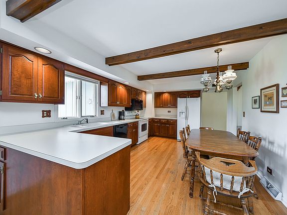 Situated in one of the most sought-after neighborhoods in Naperville's acclaimed District 203 and just moments from the vibrant energy of downtown, this charming ranch home offers sweeping views of the Cress Creek Golf Course and a lifestyle of comfort, convenience, and connection. Lovingly maintained by its longtime owners, it combines timeless character with modern updates in an inviting, functional layout. The welcoming front porch is the perfect spot to sit and catch up with neighbors or unwind at the end of the day. Step inside to a spacious living room that easily accommodates gatherings of family and friends, flowing gracefully into a formal dining room highlighted by a cheerful bay window-a lovely setting for holiday celebrations and dinner parties alike. The oversized kitchen, complete with hardwood flooring, opens seamlessly into the family room, creating an ideal space for entertaining on a larger scale. Updated cabinetry provides ample storage, while features like a beamed ceiling, recessed lighting, a double sink, electric stove, and microwave elevate both style and utility. A sliding glass door leads to a cement patio and a beautifully landscaped backyard, where mature trees and open views of the golf course offer a sense of serenity and space. The family room centers around a cozy brick fireplace, complete with gas logs and a gas starter-perfect for gathering on chilly winter evenings. Down the back hall, you'll find direct access to an oversized basement with exceptional potential, previously used as a home office, and ready to adapt to your needs-whether recreation, work, or storage. The primary suite offers a peaceful retreat with carpeting, a walk-in closet, and an updated en suite bath featuring a walk-in shower. Two additional bedrooms are also carpeted, with one enjoying prime views of the golf course. The hall bath is tastefully updated and includes a tub-shower combo and a skylight that fills the space with natural light. Completing the home is a two-car garage with additional storage space, providing practical convenience to match the home's thoughtful design. This is a rare opportunity to own a ranch-style residence in a golf course community, perfectly positioned near everything that makes Naperville so desirable-top-rated schools, parks, shops, and dining.