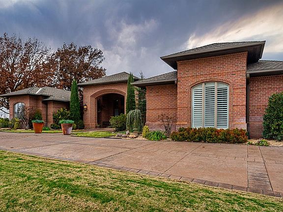Welcome to a rare single-level luxury estate in the heart of Oak Tree, blending timeless architecture with a beautifully executed 2019–2020 expansion. Set directly along the Oak Tree National driving range, this home offers sweeping golf-course views, exceptional privacy, and a floor plan designed for both everyday comfort and effortless entertaining. Inside, you’ll find expansive living spaces with white oak hardwood floors, tall ceilings, custom crown molding, and walls of windows that bring in natural light. The main living area features a beautifully trimmed fireplace, refined built-ins, and an open flow into the formal dining room and chef’s kitchen. The kitchen offers a grand curved island, high-end cabinetry, double ovens, an instant-hot tap, and views of the outdoor living area. The primary suite is a private retreat with a spacious bedroom, spa-style bath, separate walk-in closets—including a cedar closet—and the home’s signature circular glass-block shower. Three additional ensuite bedrooms provide comfort for guests or multigenerational living. A large office with full bath and an oversized bedroom/studio/flex room offer space for work, hobbies, fitness, or a second private suite. The addition was constructed by Doug Poff Homes with a conventional foundation engineered to match the original Armstrong build. Custom bricks, matching millwork, and solid wood doors ensure a seamless integration. Mechanical upgrades include four HVAC systems (three geothermal), two recently replaced high-efficiency 50-gallon water heaters, a new whole-house water softener, an irrigation well, and a generator-ready electrical panel. Outdoor living includes a wide covered patio framed by brick arches, a private courtyard, mature landscaping, and an oversized three-car garage with climate-controlled workshop. A rare opportunity in one of Edmond’s premier gated golf communities.