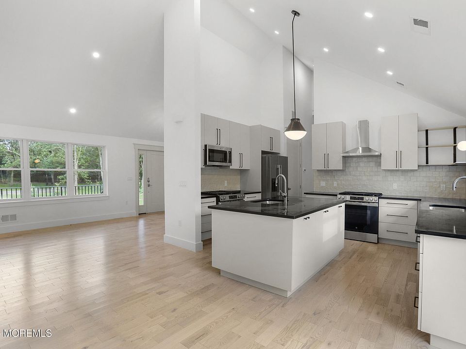Rich hardwood flooring on both levels. Open-concept layout with expansive living and dining areas.