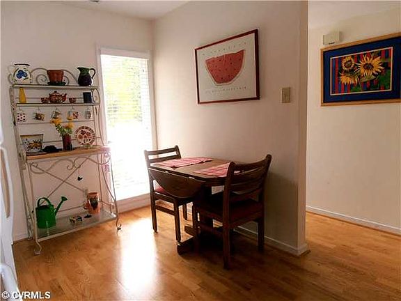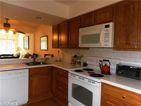 Updated condo in the Village of Midlothian. Super clean & very attractive. Hardwood floors up & down. You'll love the eat-in kitchen with wooden cabinets, pantry, built in microwave, & whisper quiet dishwasher. Refrigerator included. Living room has a vaulted ceiling with skylights, wood-burning fireplace & door to private patio. Very quiet section of the development. Dining area is open to the kitchen for ease of entertaining. Each of the two bedrooms has its own private full bath & lots of closet space. Laundry area is on second floor where it's needed. Enjoy the summertime in the neighborhood pool. Pull down attic with lots of storage space. Attached shed for more storage needs. WALK to restaurants, shopping, and post office, and just minutes to Rte 288 for all points north & south.