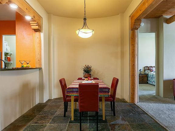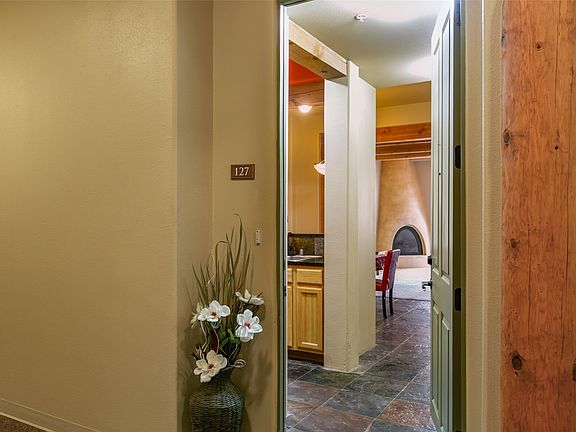 This spacious 2 bedroom, 2 bath unit is one of the largest in the community and blends luxury with classic Santa Fe charm. Inside, you’ll find soaring ceilings, traditional vigas, a cozy kiva fireplace, and slate flooring. The gourmet kitchen and baths are appointed with granite countertops, and the luxurious primary suite boasts a spa like bath, huge walk-in closet, and private access to the covered portal patio ideal for enjoying the peaceful outdoor setting.
