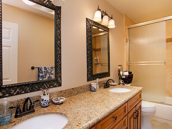 This is a wonderful remodeled home on corner lot of two cul-de-sac streets. This neighborhood of Willow Creek is in Scott's Valley which also includes Bridgewater and is in one of the top school districts in the state. It is also in close proximity to park, shopping, golf, beaches, medical offices and other support services! The interior features a gourmet granite center island kitchen with custom cabinets, quality knobs & pulls, tumbled marble back splash, Bosch and GE Caf appliances. All the bathrooms have been remodeled and the incredible master suite has been completely remodeled with extensive high quality custom cabinetry & built in dresser, marble MBA floor, dbl marble vanity, large soaking tub, custom shower with front and overhead sprays. The combo LR/DR has vaulted ceilings and is very bright. Other features include a custom front door, plantation shutters, ceiling fans, security system, family room fireplace with custom mantel, new hot water heater and plumbing was converted to copper per owner. Separate laundry room with built in cabinets, Skylights in the stairwell and remodeled second bath. The spacious outdoor living area includes a granite BBQ area and eating bar, a large stone fireplace, a huge 16 person built in spa with cascading water feature, a putting green and a stone waterfall. Additional features include a large stone patio and walks, balcony off MBR, granite outdoor eating area includes a stainless steel BBQ and a refrigerator, outdoor speakers, mature landscaping with specimen palms and a covered stone porch. The garage has a workshop area and the third car area has temporary walls making a nice office but not permitted and could easily be converted back.