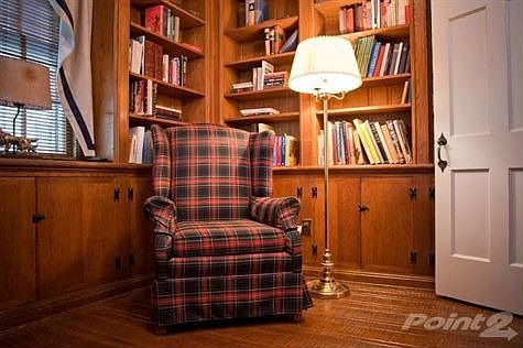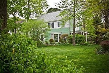 From the center hall of this lovely 6 BR, 3-1/2 BA Colonial, the cozy wormy chestnut-panelled and floored library beckons from one side, the generous-size living rm on the other side draws you towards its wood-burning hearth. The large formal dining rm's floor to ceiling bay windows overlook a stone patio & deep wooded lot. French doors lead to an open porch with patio access. Corian counters & sink, refaced cab. & laminate flrs. are recent updates to the lg eat-in kit, as are the newer dishw. & disposer. The back door opens to a breezeway leading to a 2-car gar. The 1/2 BA, lg broom closet & sports closet open to the side hall. 4 lg BR, 2 BA on 2nd; 2 BR & BA on 3rd. Ample storage.Pine panelled rec rm w fpl, work-rm & laundry.