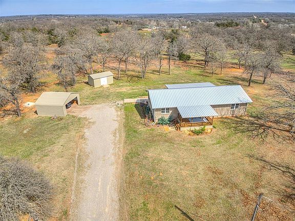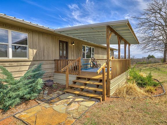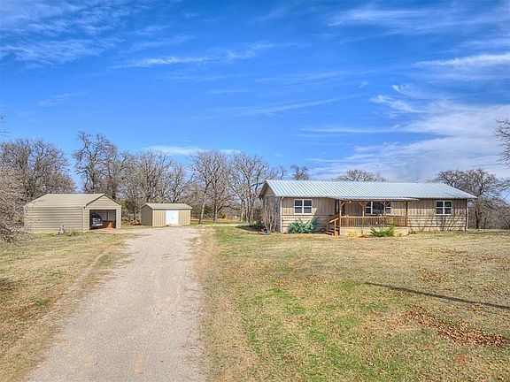 A little slice of Paradise. This lovely home sits atop a hill, with amazing sunsets. The home has been remodeled top to bottom...literally every inch of the interior. You will be greeted by a cozy porch across the front and back. Just imagine yourself sitting there with a cup of coffee watching the sun come up! Walk in to a nice sized living room, eating area attached to a wonderful kitchen with tons of cabinet space and prep space. The primary bedroom has a walk-in closet and a well-appointed ensuite on the south side. The north side has the secondary bedrooms with a guest bath in between. Windows are newer and the metal roof will last a very long time. There is an inground storm shelter & 2 outbuildings, could be used as a work space or garage. Come see this beauty soon!