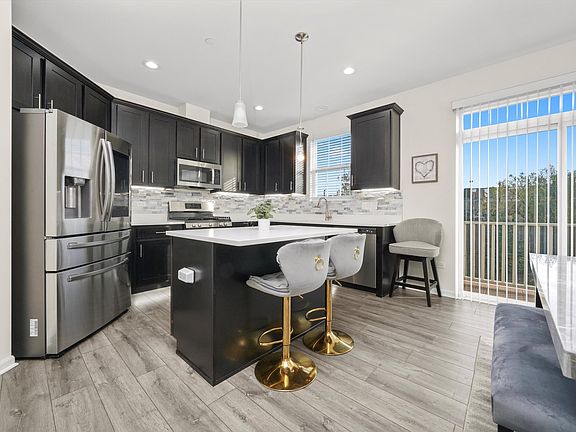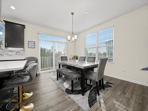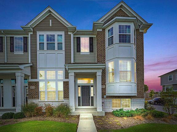 Welcome to the most prestigious corner of The Square at Goodings Grove! This stunning 1,910 sq. ft. Clark townhome has been meticulously maintained and thoughtfully upgraded with unique, designer features you won't find in a standard builder-grade home. Spread across three levels of living space, this end-unit residence features 2 bedrooms, 2.5 bathrooms, a loft, and a versatile bonus room - perfect as a home office, gym, or second family room. Step inside through your attached two-car, rear-load garage, where you'll find a welcoming entryway with a coat closet and bright bonus room complete with double windows. The main level offers an open-concept design that's ideal for entertaining. The great room showcases a designer bay window and Mannington Restoration plank flooring that flows seamlessly throughout. The adjacent kitchen and dining area are beautifully appointed with 42" Norwich Maple Espresso cabinetry, Arctic White quartz countertops, GE stainless steel appliances, dual pantries, and a center island. A sliding glass door leads to your private balcony-perfect for morning coffee or evening relaxation. Upstairs, discover two private ensuite bedrooms and a convenient third-floor laundry room. The primary suite is a true retreat, featuring a bay window, dual sinks, a 5-foot Dal-Tile shower, and a custom walk-in closet. The second bedroom also includes its own private bathroom with a tub/shower combination and elegant tile finishes. Additional highlights include a guest powder room, designer light fixtures, accent tile details, and an abundance of natural light throughout the home. Move-in ready and located in one of the community's most sought-after spots, this Clark model is truly exceptional-offering luxury, comfort, and convenience in every detail.