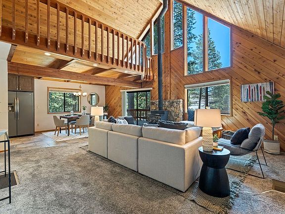 This beautiful Tahoe Donner chalet-style home is nestled on a secluded corner lot amidst the pines, offering a perfect combination of rustic charm and modern comfort. The spacious, well-maintained retreat features soaring ceilings, south facing windows and an inviting wood-burning fireplace. The recently updated kitchen and bathrooms enhance the home's contemporary appeal. On the main floor, you'll find a great room that seamlessly combines the living, dining, and kitchen areas, along with two cozy bedrooms and a guest bath. The upper level includes a spacious master bedroom with an en-suite bath and an airy loft, creating a private sanctuary. The lower level boasts a generous bonus family room, complete with a full bath and bar, ideal for hosting guests or unwinding after a day of adventure. A large deck off the front living area is perfect for BBQs and relaxation, allowing you to fully immerse yourself in the surrounding nature. Located in the desirable Ski View Loop neighborhood, this home offers close proximity to Trout Creek Recreation Center and The Lodge, making it an ideal blend of convenience and serene retreat. Don't miss the opportunity to own this exceptional property!