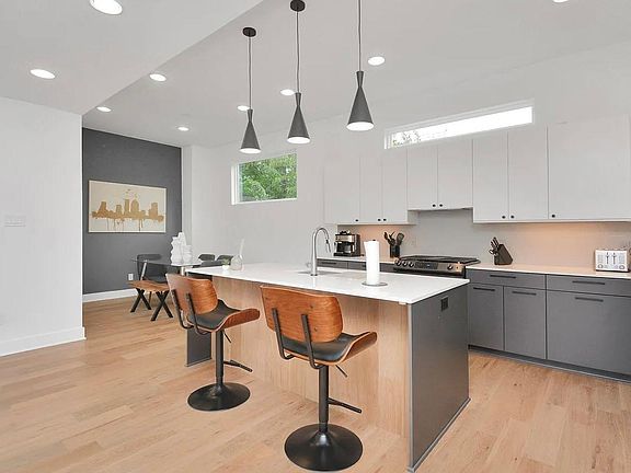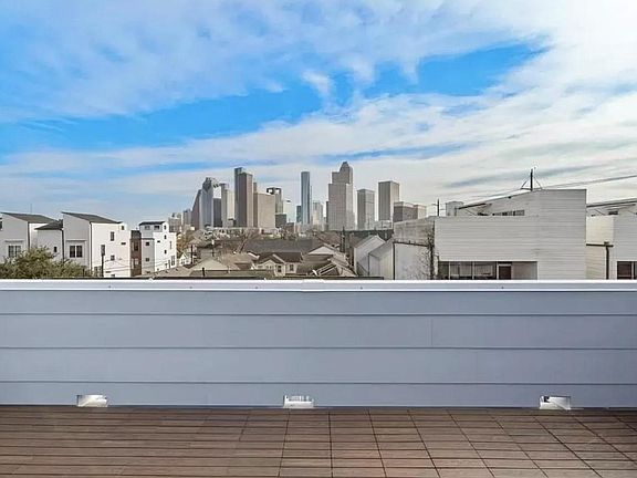 This four-story masterpiece blends bold architecture with sweeping skyline views. The dramatic two-story foyer, where a floating staircase sets the tone for sleek sophistication. The open-concept living room flows onto a spacious balcony, while the chef's kitchen impresses with a large island, European-style cabinetry, and quartz countertops. The third-floor owner's suite showcases breathtaking skyline views and a spa-inspired bath with a freestanding tub and oversized walk-in closet. Secondary bedrooms feature en-suite baths and generous storage. A versatile flex space offers unobstructed views ideal for an office, bar, or fitness area. The fourth-floor rooftop terrace delivers the ultimate entertainment space, complete with downtown views and hookups for gas, water, and TV. Additional features include European oak wood floors, smart home upgrades, and a private driveway. Located in the heart of Houston, you're steps from Buffalo Bayou Park, dining, and minutes from downtown.