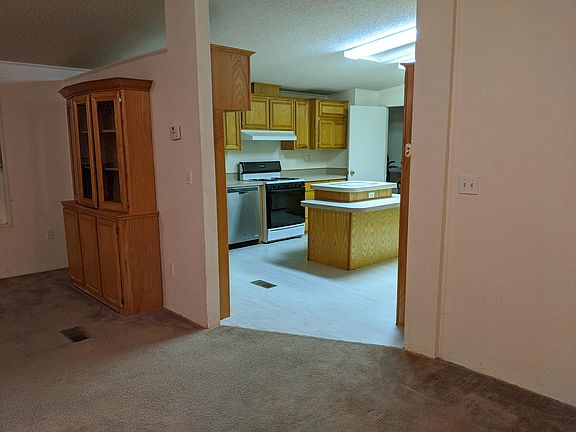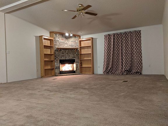Great home with a large yard. Well constructed manufactured home with full tape and texture walls and great insulation. Master suite has a separate garden tub and shower. Two additional bedrooms with another full bath. The kitchen is large with an island. A nice fireplace frames the large living area waiting for its new family! All appliances stay with the home. New carpet installed summer 2023! This home is deeded to the land and cannot be moved.