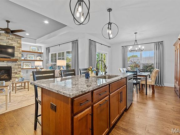 Craftsman style ranch with 4 bedrooms, 3 full baths on a level lot in Shadow Wood Subdivision. An open floor plan makes this home great for entertaining, or simply enjoying moments with your family. Spacious kitchen with a large island, granite countertops, backsplash, under cabinet lighting, stainless appliances, (gas range, dishwasher, microwave, refrigerator) Relax on the covered patio with all the beautiful landscaping! Wood floors, stone fireplace, built-ins and many windows to bring in bright light. Separate bedroom plan with primary bedroom and laundry on the main floor. Open staircase to a finished family / rec room, bath, and bedroom. 3 car garage and extra storage space.