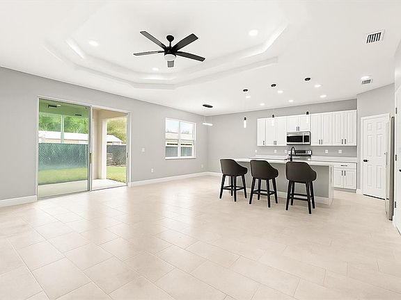 One or more photo(s) has been virtually staged. Stunning new construction property located in the heart of Haines City, in a quiet community with no HOA. This modern 3 bedroom, 2 bathroom home is packed with upgrades and extras that you won't find in any comparable new construction home - including trey ceilings, 42" cabinets, tile throughout, large covered lanai, upgraded fixtures in the bathrooms and kitchen, and pre-wired internet connection in every room. It is a split floor plan with the large master suite in the rear of the house for privacy and features a large walk-in closet and an attached bathroom with a dual sink vanity. The deluxe gourmet kitchen is designed for entertaining with granite counter tops, island bar, extra cabinets, 2 large pantries, stainless steel appliances, and a kitchen nook. The covered lanai is perfect for grilling or relaxing and enjoying a true florida lifestyle. Park your cars in the spacious 2 car garage or extra long driveway. Located in a friendly community, this home is just minutes away from local parks, shopping, and dining options, with easy access to major thoroughfares. Don't miss out on the opportunity to make this beautifully crafted new home yours!