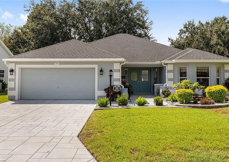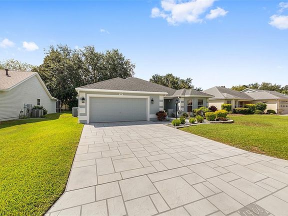 Elegant TURNKEY 3BR/2BA residence in the Village of Santiago offering 1,768 sq ft under heat and air with a 2-car garage, including a 2019 roof, 2022 HVAC, and 2022 tankless gas hot water heater. The remodeled kitchen (2021) showcases quartz countertops with granite sink, island, crown-moulded cabinetry with pull-outs, under-cabinet lighting, glass tile backsplash, and premium appliances. Spacious living and dining areas feature luxury vinyl flooring, solar tubes, and Tiffany-style lighting for a bright atmosphere. The owner’s suite provides lanai access, walk-in closet with custom shelving, and an upgraded bath with dual vanities. A private guest wing offers two bedrooms, one with murphy bed, and an updated bath. Outdoor living shines with an expansive 33x13 birdcage with stamped concrete, grill gazebo, and Bromine swim spa. Additional highlights include a double-door entry with leaded glass, stamped driveway, landscaped beds with leaf-guard gutters, epoxy-finished garage with hurricane door, attic access, and built-in workbenches.