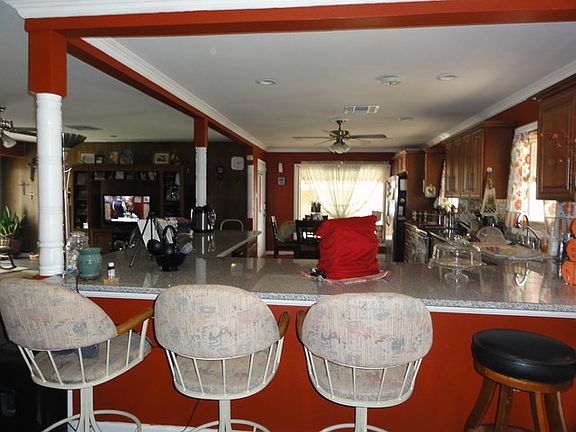 What a unique find - tons of room in the city. Two bedroom with two full baths and a office/study that could be your 3rd bedroom. This home has 2,457 sq. feet, open floor plan with many updates, walls and walls of windows, beautiful focal point fireplace in living area that opens up to kitchen and dining. New beautiful flooring, cabinets and granite in kitchen. Home sits on large lot with 2 storage units, covered front and back patios, water well, 2 car garage, front carport with circle drive.