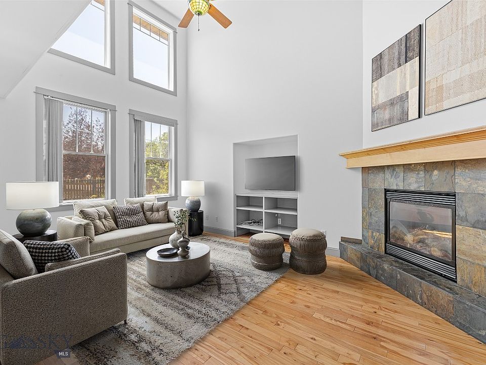 Front porchMain-level powder roomSoaring vaulted ceilingsCozy fireplacePlenty of natural light