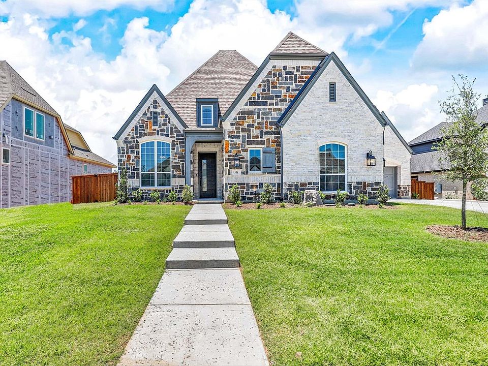 MLS# 20359444 - Built by Highland Homes - Ready Now! ~ This two-story home has everything you need & more! The exterior features a light brick with grey stone, 3 car split garage with direct entry in the home, the interior showcases a beautiful and updated color palette that combines black and neutral color schemes. Generously placed wood flooring throughout the common areas including hardwood stairs, black wood ceiling beams in the family room, upgraded carpet and pad. The farmhouse kitchen offers painted cabinets & quartz countertops, & bathrooms feature stunning accent tiles. Wet bar is located in the game room, each bedroom has its own bathroom, utility sink with cabinets for maximum storage, the primary bathroom offers an oversized shower with built in linen storage. There are many more designers touches you have to see!