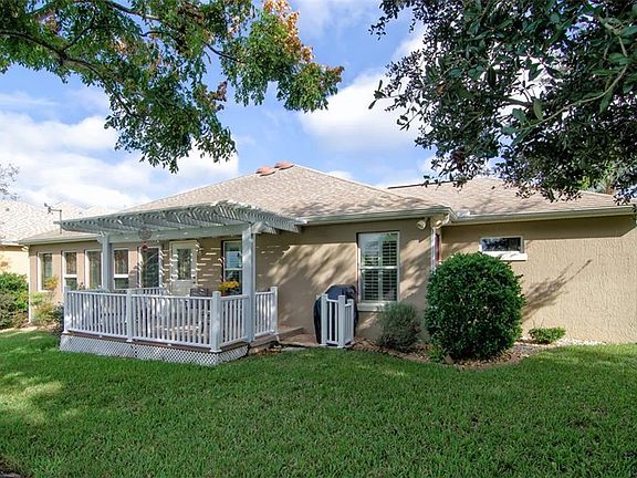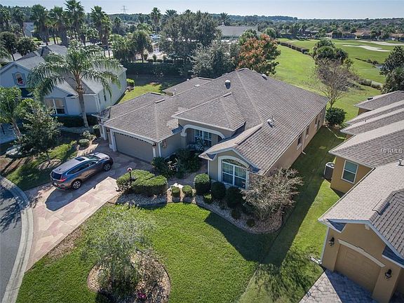 A wonderful value for this unique designer Gardenia, 3/ 2/ 2.5 car garage , located in the popular village of Caroline. All conveniences, including Lake Sumter Landing are just a short golf cart ride away. This 2,490 square feet stretched and expanded home provides an open feel with plenty of living and storage space. The 30x10 Florida room overlooks a golf course and water view located on Caroline of the Mallory Hill Country Club. An outside patio, complete with a pergola enhances this panoramic view. The main living area has all tile flooring. The kitchen features granite countertops, custom cabinetry, a center island, stainless appliances and a gas stove.. The master bedroom has dual closets with one closet expanded, dual sinks and a roman shower. In addition, there is a 10x12 den/office with built-in shelving off of the master. There are 2 guest bedrooms with the front room with a closet. The home has 7 solar tubes. The oversized garage room for 2 cars and a golf cart with additional room for a workshop, crafts area or storage. The attic has pull down stairs, and has carpeted subflooring for additional storage. This beautiful home is professionally landscaped with a custom decor driveway and is located on a very quiet cul-de- sac. THE BOND PAID and there is a one year home warranty. The owners will consider financing. Taxes: $2,286.72 Non-AdValorem Assessment: Fire $124, Maint: $590.93