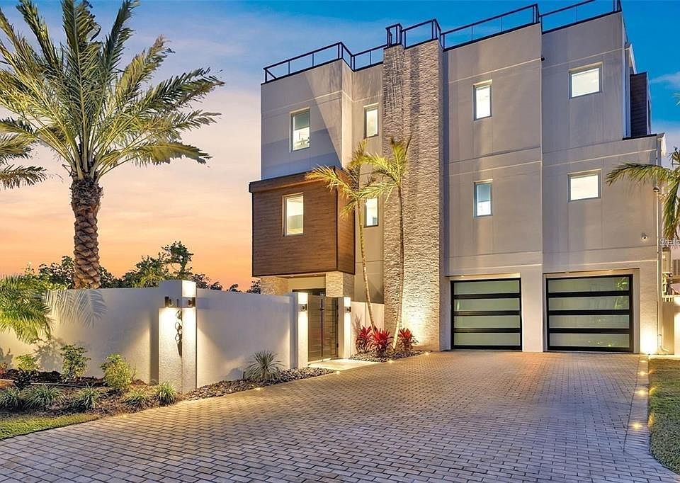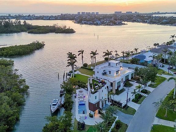 Welcome to 1406 Tangier Way, a breathtaking expression of coastal contemporary luxury in San Remo Estates in Sarasota, where architectural excellence meets waterfront serenity. This 3,294 sq. ft. home is a seamless blend of sophistication, innovation, and artisanal craftsmanship, offering four bedrooms, three full baths, and unparalleled views of Sarasota Bay. Every detail has been meticulously curated, from the custom Doca cabinetry, hand-crafted and imported from Spain, to the high-grade Portuguese porcelain countertops that extend from the kitchen to the ceiling, creating a striking visual statement. The gourmet kitchen is equipped with state-of-the-art Fulgor Milano appliances, an oversized island, and bespoke finishes, setting the stage for an elevated culinary experience. Walls of strategically placed windows flood the interiors with natural light, enhancing the contemporary loft-inspired aesthetic while showcasing the property’s unrivaled water views. The second-floor master suite is a sanctuary of refined elegance, featuring a private office, floor-to-ceiling water views, and a spa-inspired en-suite bath adorned with intricate, high-end tilework, exuding a sense of tranquility and indulgence. Ascend to the rooftop terrace, where artificial turf, a wet bar, and panoramic views create an unforgettable setting for sunset soirees and intimate gatherings under the stars. The outdoor living space is nothing short of an oasis, boasting leather-marble walkways, a champagne spa, a gas fireplace, and a fully equipped outdoor kitchen, designed for seamless alfresco entertaining. An automated mosquito misting system ensures year-round comfort, while Control4 smart home technology integrates lighting, climate, security, and entertainment at the touch of a button, delivering an effortlessly luxurious lifestyle. Boaters will revel in the two newly constructed boat lifts and direct access to Sarasota Bay, making this home an extraordinary retreat for waterfront living at its finest. Built with strength, timeless beauty, and the highest level of craftsmanship, this extraordinary waterfront residence is truly a rare find—a once-in-a-lifetime opportunity to own an unparalleled slice of Sarasota’s coastal paradise. Schedule your private showing today—this exclusive sanctuary could be yours.