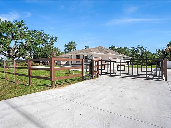 Welcome to Your Florida Home! Newly built in 2025, this stunning modern block home sits on a cleared, fully fenced 1.05-acre lot — beautifully sodded with lush grass, stately palm trees, and a few charming pines for that Florida touch. Step inside through an impressive 9-foot dual door entryway crowned with an elegant chandelier that welcomes you into over 4,600 total square feet of refined living space — including 3,375 sq ft under air with 4 spacious bedrooms and 3.5 luxurious baths. The expansive master suite is truly a private retreat featuring a large his-and-hers walk-in closet, a spa-like bathroom with double vanities, a soaking tub, and a stunning walkthrough triple shower. A second bedroom offers its own ensuite bathroom and walk-in closet, while two additional bedrooms share a convenient Jack-and-Jill bathroom layout — perfect for family or guests. Designed for entertaining, the open floor plan flows seamlessly from the formal living room to a dedicated office with built-in cabinetry, and into the grand family room and gourmet kitchen. The chef’s kitchen boasts an impressive 12’ x 6’ quartz island, extensive white cabinetry, and a complete set of premium KitchenAid stainless steel appliances, including a glass cooktop and sleek range hood. Outside, you’ll love the oversized 3-car garage and expansive wrap-around driveway, providing plenty of parking for family and guests. This is modern Florida living at its finest — spacious, stylish, and move-in ready!