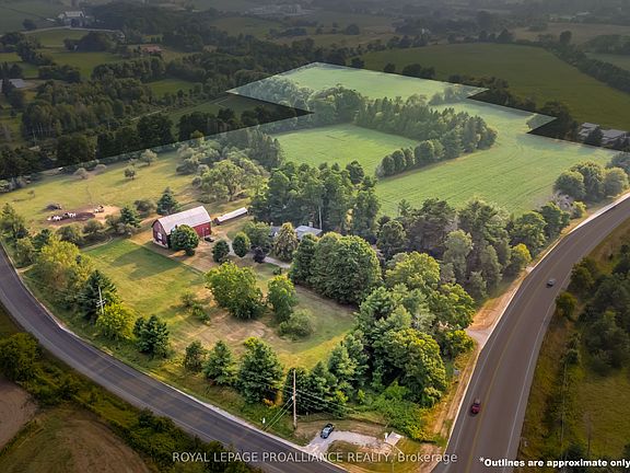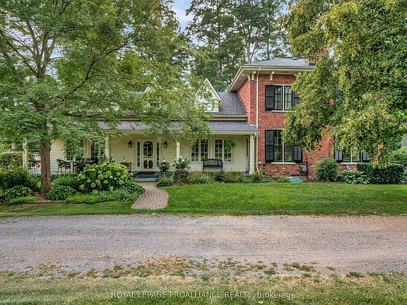 Welcome to this beloved county gem, a century old red brick home located just on the edge of Bloomfield, elegantly set back from Loyalist Parkway in a grove of conifers. This home is historically significant, as seen in The Settlers Dream as the Simpson Mallory house, with similarities to its neighbours The West Lake Boarding School and Fair Lea but with the added benefit of 30 acres of prime agriculture land under cultivation. The classical symmetry is compared with grand homes like Macaulay House and the Striker Walmsley House in Picton. When Benjamin Simpson, a wagon maker came to this town in 1837 it is likely that the present kitchen tail of the house was a wooden frame farmhouse facing Mallory Crossroad. This outstanding home showcases fascinating architectural features and enduring touches that reflect its Quaker influence. Bloomfield was established in1799 and remains a village with many historical homes and charming shops on Main Street. The house boasts 5 bedrooms and 4 bathrooms, an elegant living room and dining room, perfect for entertaining and family gatherings. The kitchen has been renovated to reflect the character of the home. This property has a fabulous old barn, a workshop and a woodshed, and a lane way access to the Millennium Trail to complete the perfect picture. Only six minutes from Picton home to the Prince Edward County Memorial Hospital, The Regent Theatre, The Royal Hotel, The Waring House, many unique shops, as well as numerous fine dining restaurants, and the PEC Yacht Club. The County is one of the premier destinations for those seeking unforgettable experiences whether its exploring nature, enjoying watersports, savouring food and wine, or relaxing at the beaches. There truly is something for everyone!
