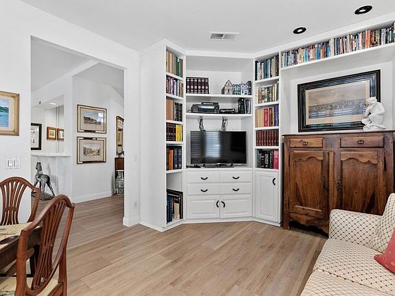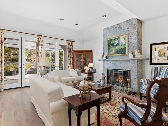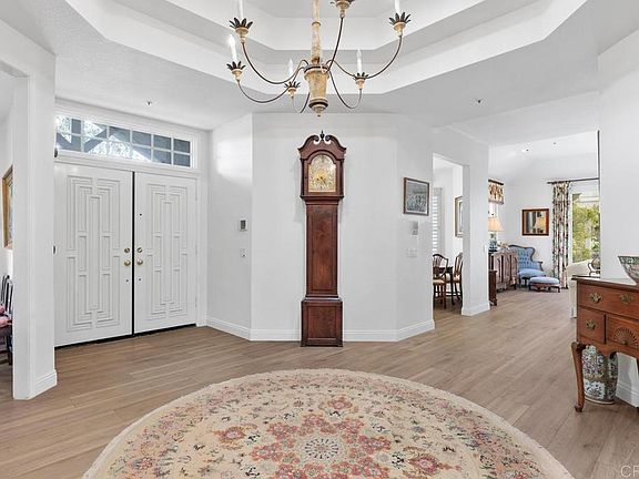 Located in the charming, gated community of Stratford, this single level home has been elegantly upgraded throughout. The chef’s kitchen boasts beautiful cherry wood cabinetry and views of the San Dieguito Valley and Fairbanks Ranch Country Club. Brand-new luxury vinyl flooring has been added in all living areas. In addition to the 3 ensuite bedrooms, there is a grand office flooded with natural light, cozy library, gracious dining room, and lovely living room with full bar and granite mantled  fireplace.  The primary bedroom suite offers dual bathrooms each with walk-in closets, vaulted ceilings, dramatic gas-burning fireplace, and garden views. Roof was replaced in 2018. Stratford is a highly sought after gated community consisting of 87 single family residences. English Tudor/Country French designed homes that are all single level with a community pool, spa and gym. Gentle breezes, rolling hills and forever views attract all ages with close- proximity to many private golf courses, schools, restaurants, shopping, easy freeway access and of course the Pacific Ocean. Stratford, in the Villages of Fairbanks, was designed by architect Robert Bowlus and constructed by Watt Industries of Los Angeles.