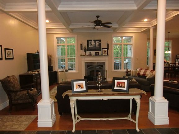 Enjoy living on 4.46 wooded acres just minutes from town! Enter the front door and be greeted with a large foyer and columns leading to the Great Room that opens to the kitchen and both dining areas. Enjoy entertaining in the custom kitchen with built-in appliances and attractive back splash. Split-bedroom design and super high ceilings throughout, custom-tiled showers, main floor laundry, and heated floors are just a few of the custom amenities.