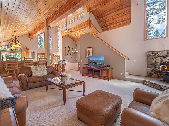 Nestled inside Tahoe Donner's prestigious Skiview Loop, this lovely, split level chalet brings large scale mountain living in a wonderful location. Family and friends will enjoy the integrated living space filled with light - there's room for all! The BIG great room offers soaring ceilings, access to the private loft (great for remote work and guest overflow), a cozy wood burning stove and easy access to the spacious, rear deck overlooking the greenbelt setting. The open style kitchen brings a high bar and large island with an adjacent, spacious dining area and front deck access. Conveniently located on the main living level, the spacious primary suite and its ensuite bath with walk in closet provides a cozy enclave. A powder bath and laundry room completes this floor. The lower level brings a large family room with cool barn wood finishes, wet bar and rear patio access. Two bedrooms, a shared bath with ensuite access from one bedroom and plenty of cabinetry and storage is nicely designed. The easy living driveway and large garage makes mountain living so convenient! This prestigious location and delightful property located in mid-Tahoe Donner is sure to please!