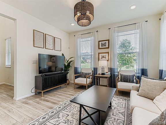 The heart of the home is the stylish kitchen, featuring white cabinetry with sleek modern hardware, stainless steel appliances, and an added beverage refrigerator for convenience and entertaining. The open layout flows seamlessly to the dining and living areas, making this space ideal for gatherings or relaxing evenings at home. Upstairs, the nicely sized primary suite offers a beautifully finished bathroom featuring modern design touches. With three total bedrooms plus a dedicated office, there’s plenty of room for work, guests, or hobbies. The finished basement includes a full bath and provides even more flexible living space for a rec room, fitness area, or guest suite. Enjoy the benefits of a premium corner location surrounded by open space for extra privacy and quiet. The low-maintenance lot includes landscaping and snow removal, allowing you to spend more time enjoying your home and less time maintaining it. The community also offers nearby parks and miles of walking paths that connect throughout the area — perfect for morning jogs, evening strolls, or taking in Colorado’s beautiful sunsets. Located in the award-winning Adams 12 Five Star School District, this home offers both convenience and quality. Just minutes from shopping, dining, parks, and major highways, you’ll love the easy access to Denver, Boulder, and the entire North Metro area. Beautifully updated, privately located, and perfectly maintained — 14067 Jackson Street is ready to welcome you home!