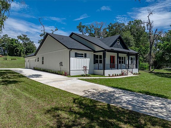 A fresh life of luxury begins in this remarkable 3,197 sq ft custom home built in 2025, perfectly placed at the end of a cul-de-sac within an intimate eight-home community. Sitting on just over an acre, close to all that Dade City has to offer, this 5 bedroom, 4 bath, 3 car garage property delivers a thoughtful layout, high-end finishes, and plenty of space indoors and out with 4,667 sq ft under roof. A charming front porch greets you with classic board-and-batten accents, modern colors, and just the right touch of farmhouse character. Inside, soaring vaulted ceilings with warm wood beams immediately draw the eye upward, setting the tone for the expansive open layout. Luxury wood-look vinyl plank floors run seamlessly throughout much of the home, connecting the living room, dining area, and chef’s kitchen into one flowing, light-filled space. Large sliding glass doors open to a generous covered back porch, extending your living space outdoors for easy entertaining or quiet evenings. The kitchen was designed for beauty, function, and entertainment, featuring striking two-toned cabinetry with matte black hardware, a built-in double oven and microwave, a cooktop, a stainless steel dishwasher, and a refrigerator. A massive center island offers breakfast bar seating, while glass-faced upper cabinets and a spacious walk-in butler’s pantry provide abundant storage and display space. Privately tucked near the front of the home, the first of two suite-style bedrooms offers a one-of-a-kind retreat. Its spa-inspired bathroom includes a dual-entry walk-through shower, a freestanding soaking tub, two separate vanities, and a large custom-organized walk-in closet. Down the hall are a full guest bath, a guest bedroom or office, and a well-appointed laundry room. On the opposite side of the home, a third bedroom with its own private ensuite and walk-in closet offers plenty of privacy, while two additional bedrooms share a beautifully designed Jack and Jill bath with dual sinks and a walk-in shower. The oversized three-car garage is ideal for car enthusiasts or anyone who values extra space. Every detail in this home was carefully chosen to create a truly fresh start for its very first owner. Contact us today to arrange your private showing and experience this exceptional property for yourself.