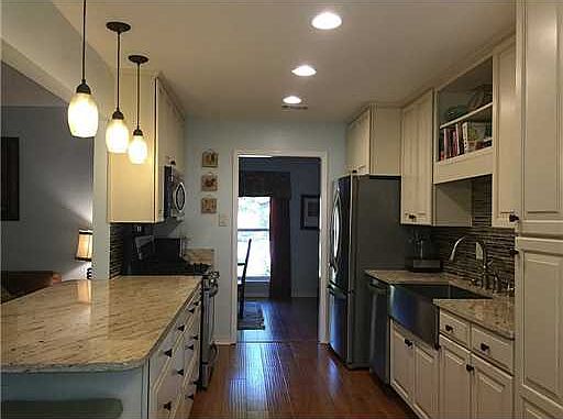 Charming renovated home in the quiet back end of Subdivision. Open kitchen/family room w/ bay window breakfast area. Custom kitchen cabinets, granite, oversized farm sink & s.s. appliances. 5 burner gas stove. New windows/doors. Tile & hand-scraped laminate. Lush lot! Much to love indoors & out!